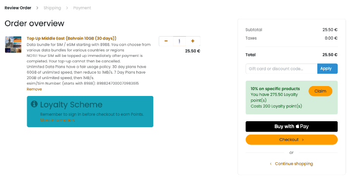 Für jeden ausgegebenen Euro erhalten Sie 1 Treuepunkt. Sie können diese Punkte dann im Austausch für einen Rabatt auf SIM-Karten und eSim-Aufladungen verwenden. Sie können verwendet werden, um ein Datenpaket von überall auf der Welt zu laden, die wir anbieten.